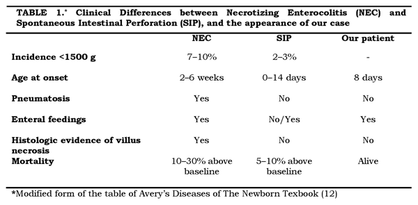 Table 1: Clinical Differences between Necrotizing Enterocolitis (NEC) and Spontaneous Intestinal Perforation (SIP), and the appearance of our case |