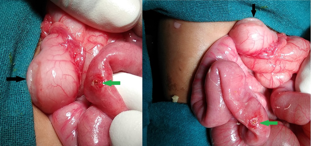 Intraoperative photographs showing pyloromyotomy scar represented by a faint furrow (black arrow) and mid-ileal perforation (green arrow). |