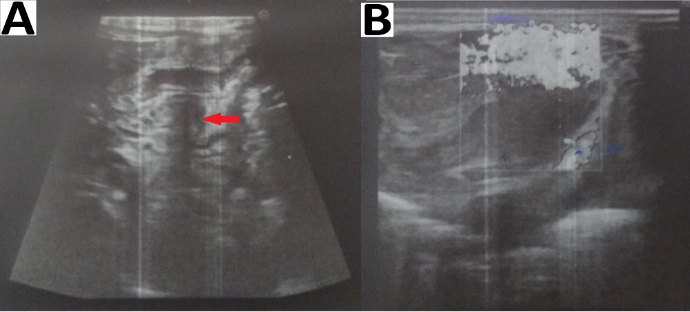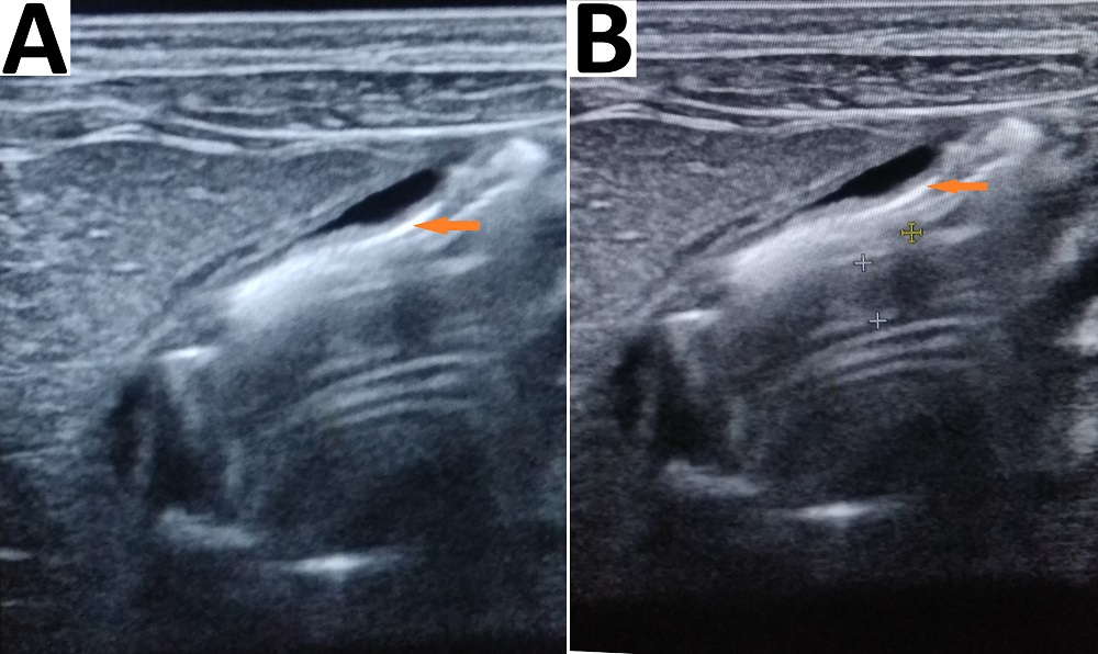 Photographs showing abdominal ultrasound scans performed after pyloromyotomy (Group A) with intraperitoneal blood collection (red arrow) around the pylorus (red arrow; A) and collection in Morrison’s pouch (B). |