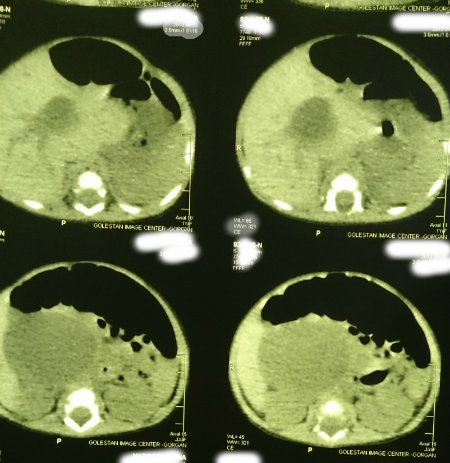 A 22-day-old female infant was admitted due to prolonged jaundice. She was icteric from the fourth day of life along with acholic stools and abdominal distension. Direct hyperbilirubinemia was detected in blood tests. Her total bilirubin and direct bilirubin were 19mg/dl and 10.3mg/dl respectively. Clotting profile was normal. Liver function tests (LFTs) were AST (84IU/L), ALT (81IU/L), and Alkaline phosphate (2024 IU/L). The abdominal sonography showed a choledochal cyst (56x43x46mm) with few echogenic areas in it. Wall thickness and echogenicity of gallbladder as well as intra hepatic ducts were normal. Abdominal CT scan confirmed the existence of choledochal cyst (Fig. 1). The patient was operated after optimization. Operative findings included an extra hepatic choledochal cyst (type I) which was ending blind on either sides. Porta-hepatis showed type III biliary atresia. The choledochal cyst and gallbladder had no bile but mucinous secretions which were aspirated. The gallbladder and choledochal cyst were resected; the porta-hepatis dissected and Roux-en-y porto-enterostomy was performed. The wedge biopsies from porta-hepatis showed biliary atresia as donated by diffused feathery degeneration, cholestasis, pseudoacinar transformation, focal giant cell, bile duct proliferation, and fibrotic tissue. The histopathology of choledochal cyst showed a biliary epithelial lining and that of gallbladder showed congestion and near total obliteration. Postoperatively, the jaundice improved and the patient passed pigmented stool. Patient was allowed orally and discharged on short course of prednisolone, fat soluble vitamins and prophylactic antibiotic. At present, the infant is 10- months old and thriving well. The last total bilirubin is less than 1.5mg/dl.
