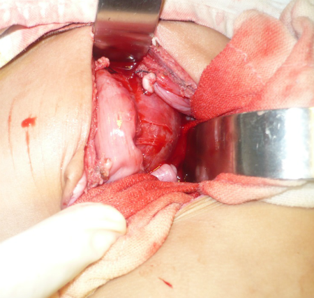 Two most important lesions that may have calcifications are type-IV SCT and neuroblastoma; but, the surgical approach to both of these lesions is different as SCT requires coccygectomy in addition to the mass excision through another incision on the buttock. On the other hand, coccygectomy and another incision are avoidable in case of neuroblastoma and other lesions at the same location. Therefore, further work including tumor markers like alpha fetoprotein (AFP) or β-HCG should be performed and interpreted with reference to the age of neonate as AFP level may be in thousands is normal in neonatal age.[4,5] The surgical approach for a rectal duplication, type-IV SCT, and neuroblastoma is initially similar, i.e., initial mobilization is done through a transverse lower abdomen incision. If the mass is cystic and external appearance is that of a bowel in intimate contact with the rectum it may be a case of rectal duplication cyst. In this case, surgeon may decide to completely excise it with additional posterior sagittal, trans-anal or trans-coccygeal approaches or excision of as much as portion with mucosal stripping of the rest through the same incision.[1-3] We had a 15-day-old male neonate presented with constipation and abdominal distension; ultrasound showed a cystic mass in the pelvis causing bilateral hydroureteronephrosis. CT scan also showed a cystic mass without calcification. AFP was in normal range. At operation, a gut like mass was present posterior to the rectum and intimately attached to it (Fig. 1). The mass was opened and mucoid secretions drained. The most part of the mass removed followed by mucosal stripping of the rest. Postoperative recovery was uneventful. Histopathology confirmed the mass a rectal duplication cyst. There is no recurrence at 1 year follow-up.