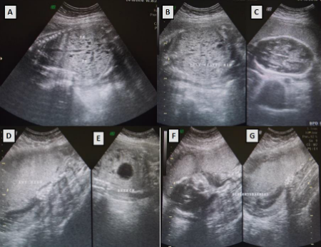 Figure 1: High resolution fetal ultrasonogram depicting (A , B, C) Hyperechoic and enlarged kidneys characteristic of in autosomal recessive polycystic kidney disease; (D) High, anterior placenta; (E) Breech presentation; (F, G)Oligohydramnios |