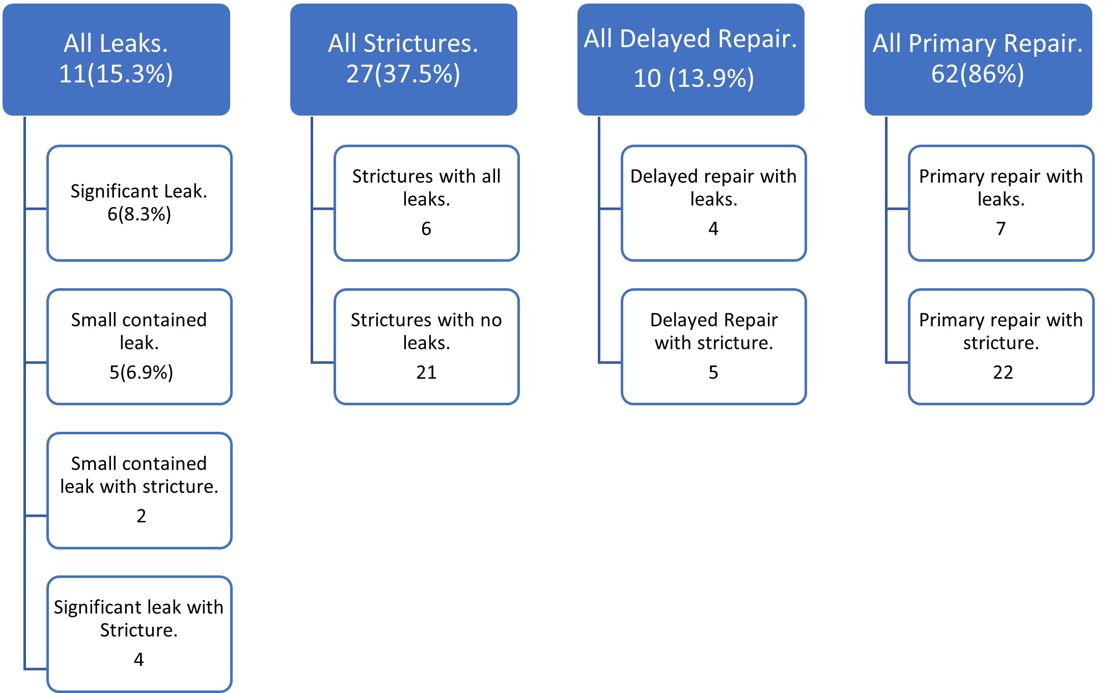 Number of anastomotic leaks and strictures encountered. Total study population =72 |