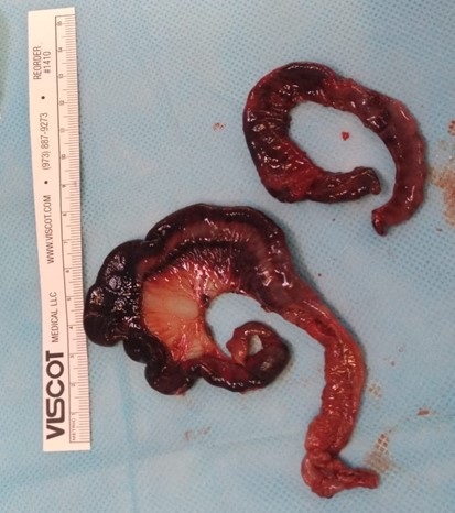 Surgical consultation was sought on the next day for abdominal distension, bilious aspirate, and an episode of bleeding per rectum. The radiograph of the abdomen showed dilated bowel loops. Ultrasonography (USG) of the abdomen showed features of small bowel intussusception. Emergency laparotomy revealed two intussusceptions, an ileocolic and jejunojejunal types (Fig. 1). Both intussusceptions required resections of gangrenous intussusceptum with end-to-end anastomosis (Fig. 2). There were no pathological lead points. Histopathology of excised segments showed full-thickness hemorrhagic necrosis only. Postoperatively, feeds were started on the fifth day and progressed gradually. He recovered well and was discharged. Subsequent evaluation for syndromic associations was done due to dysmorphic facies, post-axial polydactyly, cardiac anomaly, thymic hypoplasia, and hypocalcemia. Fluorescence in situ hybridization (FISH) analysis showed microdeletion at 22q11, diagnosing Di-George syndrome.