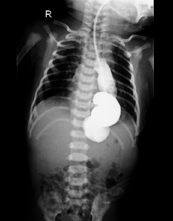 A 5-day-old male term baby (with dysmorphic features) weighing 3.4 kilograms was evaluated for an antenatally diagnosed double aortic arch on fetal echocardiography. A postnatal echocardiogram also suggested the same. CT scan thorax was done which showed a large posterior diaphragmatic hernia on the left side with herniation of the abnormally rotated stomach into the left hemithorax. Mild dilatation of the esophagus in its entire extent was also noted. Great vessels in the thorax were torturous but had normal branching pattern. A double aortic arch was not appreciated. The patient was not tolerating breastfeed, hence further workup was planned. The upper gastrointestinal contrast study showed a part of the stomach in the thorax along with tortuous and dilated esophagus (Fig. 1). At operation, the stomach was completely herniated into the thorax with associated organoaxial volvulus. The stomach was viable, therefore, a reduced back and detwisted Two cm defect was noted at the esophageal hiatus on the left side of the spine, covered by a lax peritoneal sac. The paraesophageal defect was closed. Intraoperatively a small eventration of the left diaphragm was noted which was also plicated during the procedure. Antireflux procedure and gastropexy were not carried out. The baby withstood the procedure well.