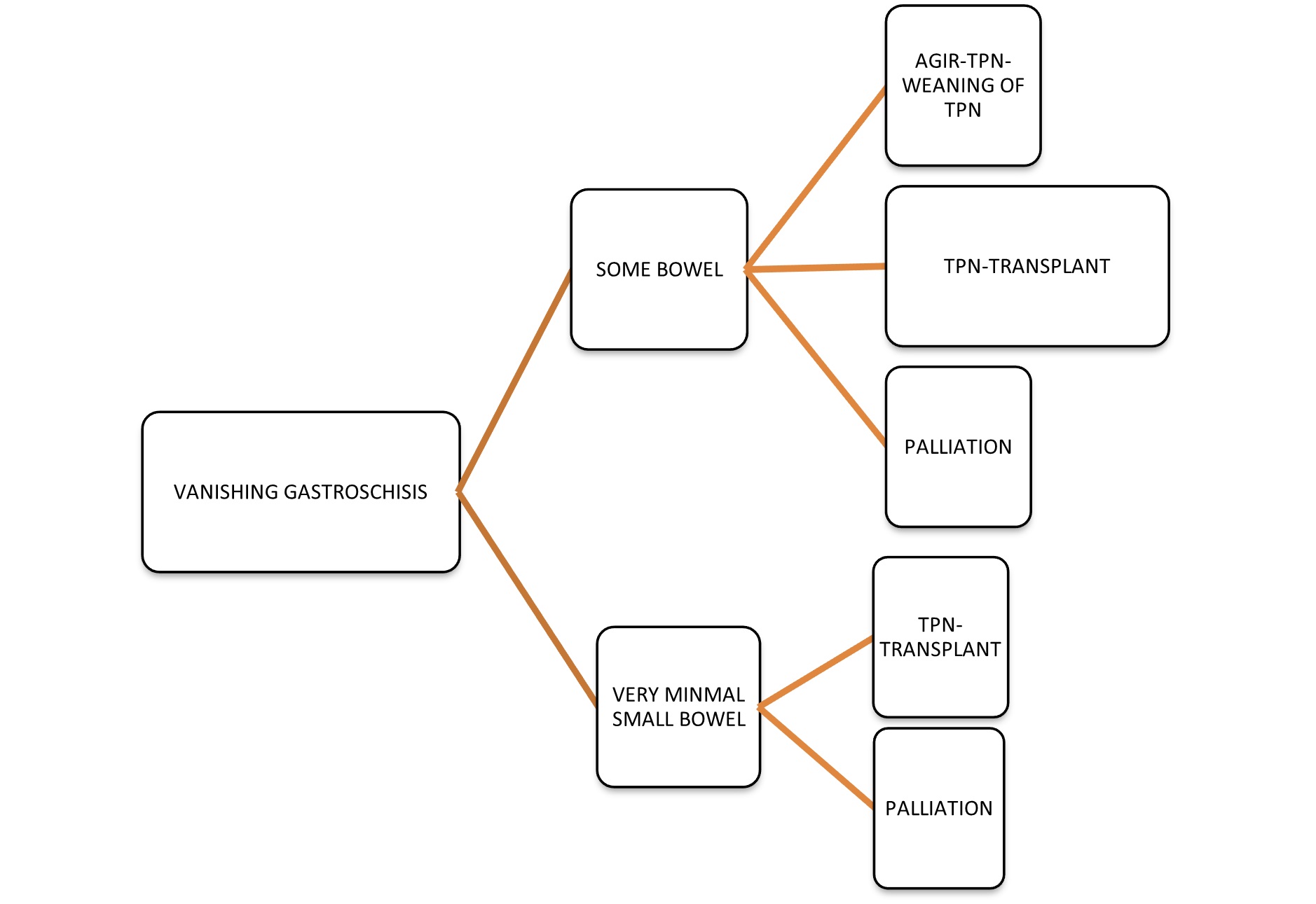 In conclusion, the prognosis of complicated vanishing gastroschisis is still very poor with high morbidity and mortality. In-utero vascular accidents in gastroschisis lead to jejunal atresia or short bowel syndrome. Advancements in neonatal bowel transplants in the future may improve the survival of patients with short bowel syndrome.