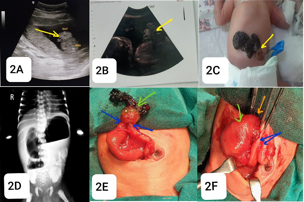 2A and 2B) antenatal scans at 18 and 26 weeks, with a yellow arrow showing gastroschisis. 2C) gangrenous VGS after birth. 2D) plain abdominal X-ray with dilated small bowel. 2E) intraoperative finding of jejunal atresia and colonic atresia at entry/exit of GS (blue arrow) and vanished midgut (green arrow). 2F) the dilated jejunum (green arrow), short atretic colon (blue arrow), and an end to back anastomosis (orange arrow). |