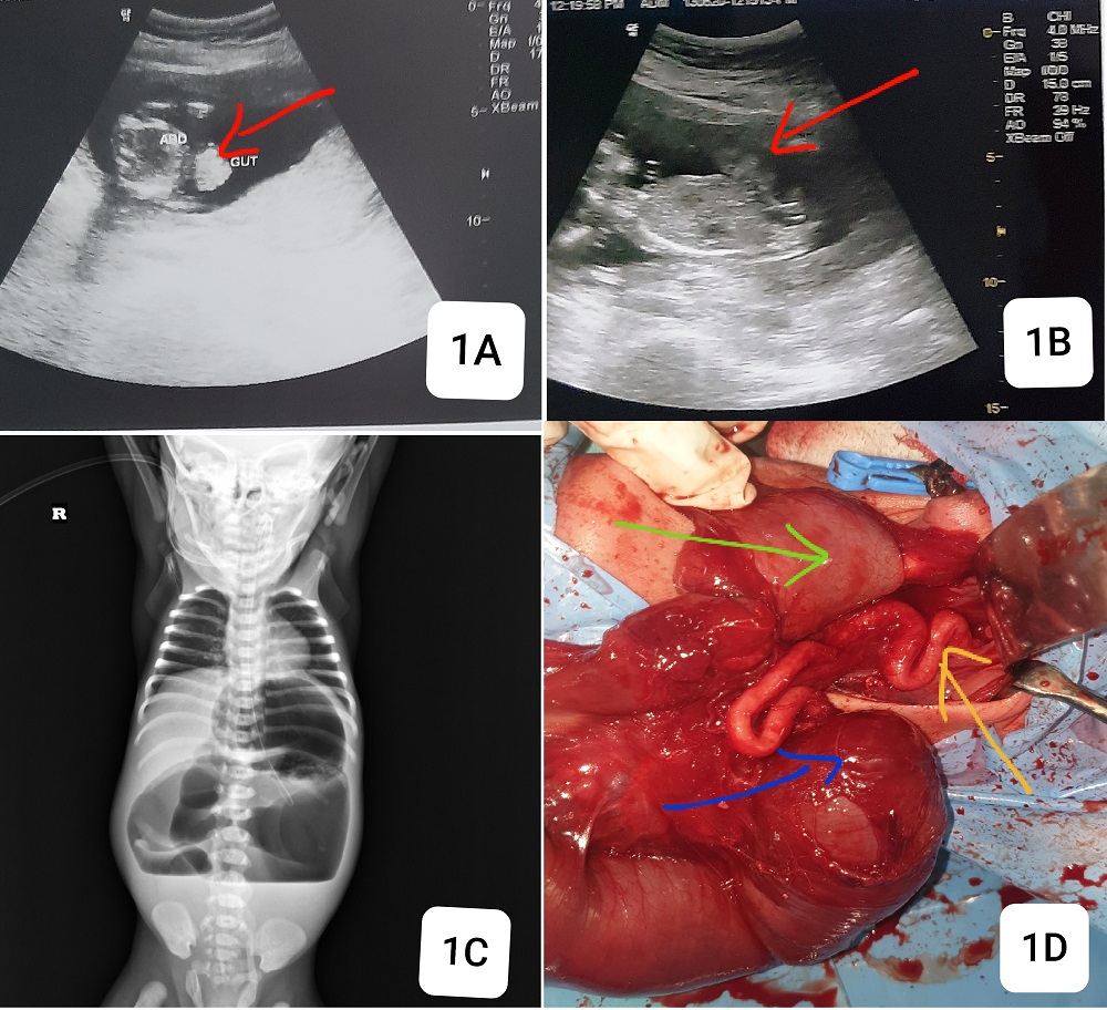 A 2-day-old female neonate was brought to our institute with bilious vomiting. On clinical examination, there was abdominal distension with visible palpable few loops, and a normal umbilicus. She was born to a 20-year-old primigravida. There was a history of antenatal diagnosis of gastroschisis. On analysis of her antenatal scans, the first obstetric scan at 16 weeks of gestation showed bowel herniation through an abdominal wall defect without any covering sac (Fig.1A,1B). Fetal anomaly scan at 20 weeks gestation was indifferent, but the 26-week scan showed additional findings of early-onset fetal growth restriction, normal amniotic fluid volume, and three vessels in the cord. Mother had labor pains at 32 weeks, and spontaneously delivered a female premature baby of 1.95kg at home. At birth, there was no visible abdominal wall defect, but the baby developed bilious vomiting and feeding intolerance on day one and referred to us by the pediatrician on day 2. Plain X-ray abdomen showed markedly dilated small bowel loops with air-fluid levels suggestive of obstruction (Fig.1C). The baby was resuscitated and optimized. On exploratory laparotomy, there was about 25 cm of remaining markedly dilated small bowel from gastro-duodenal junction to jejunal atresia (Type 1) and colon was about 15 cm. Most of the midgut structures including part of the jejunum, ileum, cecum, appendix, and most of the colon vanished (Fig.1D). A jejunostomy and distal colonic mucus fistula were formed after discussion of findings with the parents. On postoperative day 2, the stoma started functioning and feeding was started. After counseling, the parents choose palliative care at home. The patient died on the 25th day after surgery at home without any hospital visit.