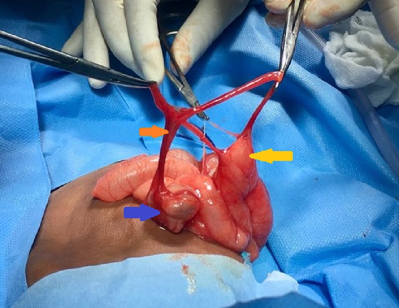 congenital adhesion bands. Ileum (yellow arrow), cecum (blue arrow), Ileo-ileal and ileo-colic bands (orange arrow). |