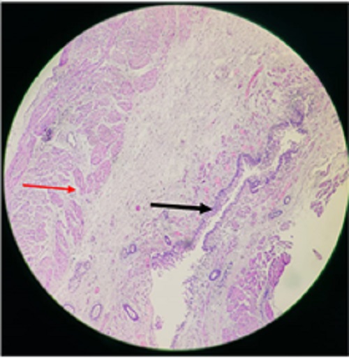 Histopathological appearance of the cyst with stratified squamous epithelium (black arrow) and double-layered smooth muscle wall (red arrow). |
