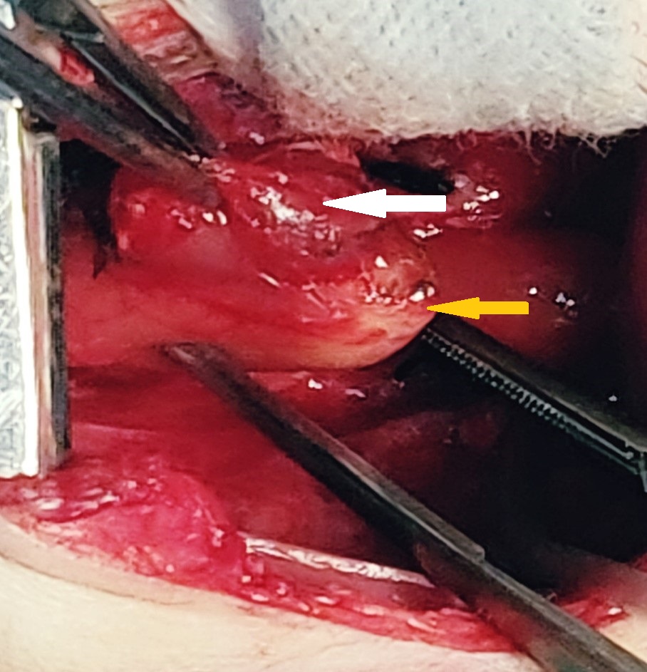 Intraoperative picture showing duplication cyst (white arrow) at the distal end of the upper pouch (yellow arrow). |