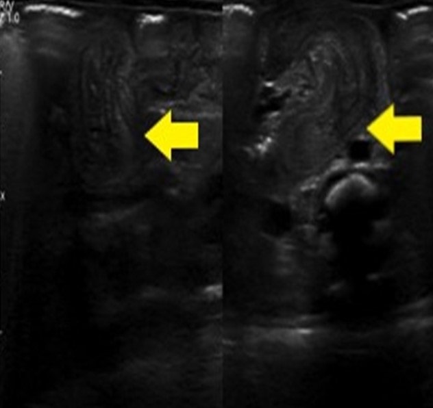 A female newborn with a birth weight of 1970 grams was delivered at 33 weeks of gestation, by cesarean section due to premature rupture of membranes. Mother had a positive history of substance abuse (opioids). The baby developed type I respiratory failure at birth and was given intratracheal phospholipids. The baby was transferred to our hospital on mechanical ventilation on day 8 of life. At presentation, the baby had a heart rate of 152/minute, a temperature of 36.9℃, blood pressure of 69/45 mm Hg, and O2 saturation of 94%. The abdomen was soft on examination, without any palpable mass, with bilious aspirates from the orogastric catheter. A plain abdominal x-ray revealed dilated bowel loops. An upper gastrointestinal (GI) series with hydro-soluble contrast was normal. Laboratory investigations showed a white blood cell (WBC) count of 18.9 x 103/L, C - reactive protein (CRP) 0.75 mg/dl, procalcitonin (PCT) 0.25 ng/dl, and a positive fecal occult blood test. After 24 hours of observation, the baby still had bilious aspirates and 2 currant-jelly stools. An abdominal ultrasound was suggestive of intussusception (Fig. 1).
