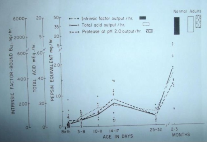 The rise in all 3 gastric parameters- gastric pepsin, intrinsic factor, and acid secretion peaks at between 14-17 days in normal term babies. Reproduced by kind permission of Springer Publishers. [13] |