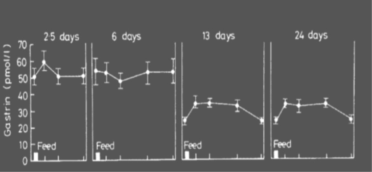 It can be clearly seen in Fig.2 that the early fasting gastrin levels are elevated without an increase after food. Later, at 13 and 24 days, the fasting gastrin levels have reduced, and a post-feed increase has developed. These findings are consistent with early maximal gastrin and acid secretion. In the early week, feeds cannot stimulate gastrin further. In later weeks, with a sub-maximal gastrin secretion, feeds can produce an additional gastrin secretion [9](Fig. 2).