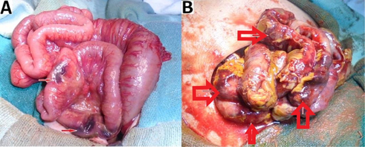 Intraoperative images showing: (A) multiple gangrenous patches in the small intestine (red arrow) and (B) diffuse involvement (ischemia) of small bowel with flakes and pus over gangrenous areas (red arrow). |