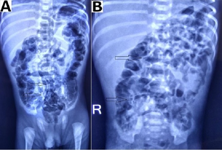 Radiographs showing (A) pneumatosis intestinalis with linear gas pattern (black arrow) and (B) bubbly gas pattern (black arrow). |