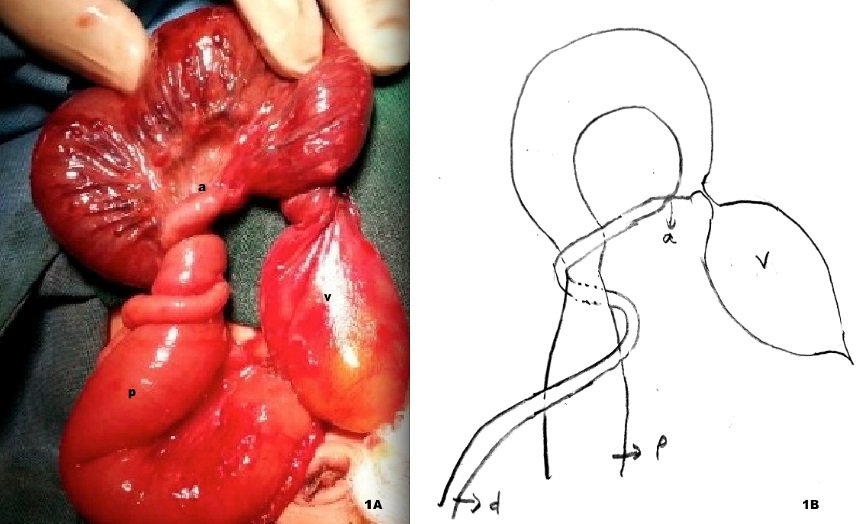 Case 1: A 3-day-old, 2.3kg, female neonate was brought with abdominal distension and bilious vomiting since day 1 of life. No antenatal scans were available. On clinical examination, the abdomen was soft and mildly distended. The abdominal radiograph showed multiple air-fluid levels with no pelvic gas shadow. Laboratory investigations were within normal ranges. On exploration, a fibrous cord was seen extending from ileum to umbilicus. The central part of this VID remnant was patent, thinned out, and filled with mucous. This remnant formed an axis around which there were 3 rotations of the adjacent ileal loop. After untwisting the bowel, type II ileal atresia was noted close to the attachment of ileum to the vitellointestinal duct remnant.(Fig.1A,1B). Resection and end to back ileal anastomosis were performed. Postoperative recovery was uneventful. Nasogastric tube feeds were started on the 6th day and gradually increased to full feeds by the 9th day. The baby was discharged on the 10th day and is doing well in subsequent follow-ups.