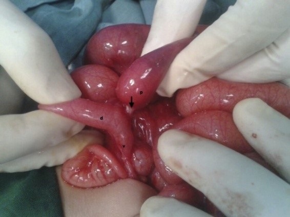 Showing compression and stricture of ileum (arrow)after untwisting of volvulus. Proximal segment (p), distal segment (d) and patent vitello-intestinal duct (v) is seen. |