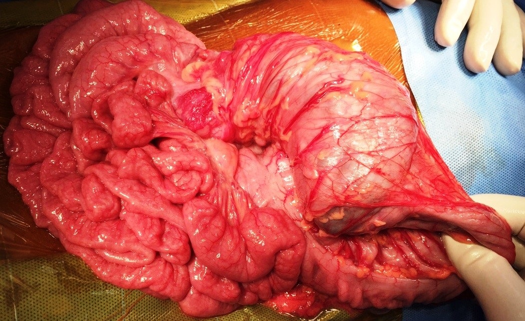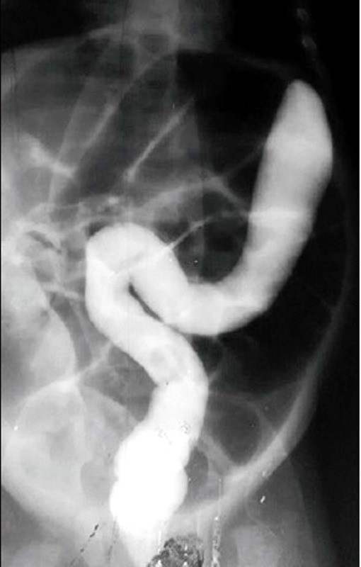 All cases were full term and age of presentation ranged from 25days to 96days. The male-to-female ratio was 3:1, median weight was 2.5kg, and median age was 36days.Most common presentation was gross abdominal distension with visible bowel loop followed by failure to thrive. History of enterocolitis was present in 3 (75%) cases and vomiting in 2 (50%) cases.One case presented with suspicion of bowel perforation on X-ray abdomen and clinical findings, thus operated on emergent basis. Rest of the cases were operated electively after investigation of the cause. Barium enema was done in other 2 cases to locate the site of obstruction (Fig. 1). Endoscopy was done in 1 case preoperatively where we were unable to negotiate beyond splenic flexure. After preliminary resuscitation and investigations, exploratory laparotomy was done in all cases. CS (Fig. 2) was in left colon in all cases. All cases were managed by resection of the involved bowel, biopsy from distal part of the colon and stoma formation.The biopsies from distal colon were positive for ganglion cells. Full thickness rectal biopsy was done to rule out Hirschsprung Disease before closure of the stoma that revealed absence of ganglion cells. Therefore, Duhamel Pull through was done in these patients as a definitive procedure. In all underlying pathology for CS was HD. Patients have beenon followed up for 2 years after definitive surgery, and all are doing well. (Table 1) describes summary of the study cases.