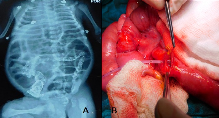A) Contrast enema showing small caliber colon with non-passage of the contrast beyond the ileocecal region and grossly dilated proximal bowel loops. B) Enterotomy showing web at the ileocecal junction with a central perforation. |