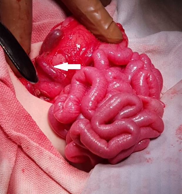 Intra-operative image of the Duodenal Atresia with pre duodenal portal vein (Arrow) |