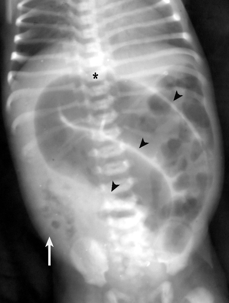A newborn female was admitted 12 hours after birth with neonatal intestinal obstruction. Physical examination revealed a patent anus. Her abdomen was tensely distended. The plain radiograph showed the typical Friemann-Dahl sign. The apex of the distended bowel loop was at the level of the 8th thoracic vertebral body. Walls of the folded bowel were seen as three opaque lines converging towards the left iliac fossa (Fig. 1). All these features were suggestive of sigmoid volvulus. Scrutiny of the film also showed fine bubbles of gas in the right lower quadrant (Neuhauser’s sign). A contrast enema was not done because of the clinical suspicion of bowel ischemia.