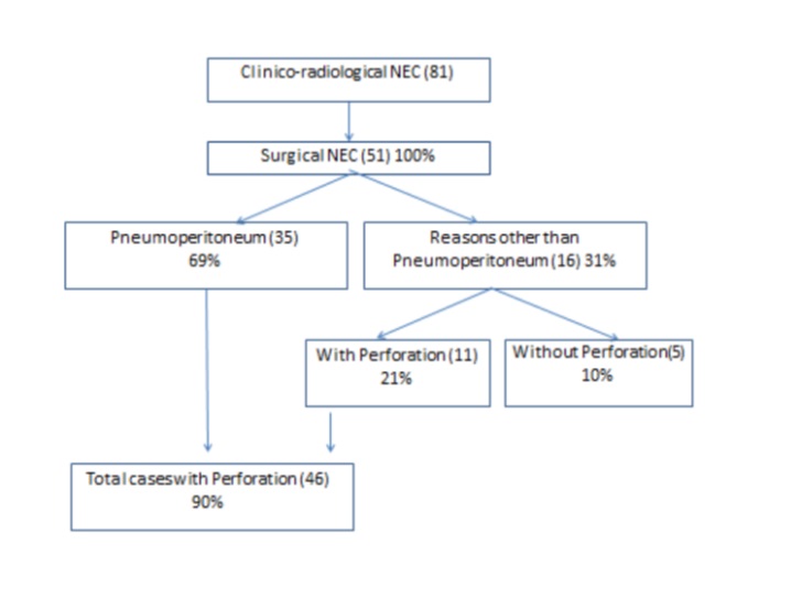Patients between the ages of 1 to 90 days having preoperative clinico-radiological features consistent with NEC (based on modified Bell’s criteria) and patients with an intraoperative picture of NEC (perforation/ Gangrenous or necrosis of bowel segment) were included in the study.