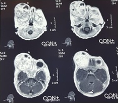 Axial T1 post contrast MRI: showing a heterogenous mass in right orbit with globe displacement. |